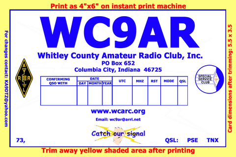WCARC Board Meetings are held on the 4th Thursday of every other month at 7:00 PM (EST). The meetings are also held in the Lower-Level Room A at the Parkview Whitley Hospital, 1260 E, IN-205, Columbia City, IN 46725. – Open to all WCARC members
