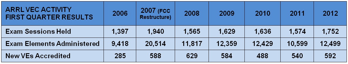 For the first quarter of 2012, Somma said that the ARRL VEC test session statistics are the highest first quarter results since the FCC’s restructuring of the license requirements in 2007: “Our exam session activity and exam elements administered are elevated. As the total number of licensees across all three license classes continues to grow each year, the demand for Amateur Radio exam sessions also grows. In turn, the number of amateurs who want to be Volunteer Examiners and who want to teach Amateur Radio classes is also rising. The ARRL VEC has seen a spike in the number of applications from General and Extra class radio amateurs who want to give back to their community by serving as examiners and instructors. This is a positive trend that we expect will continue over the coming months.”