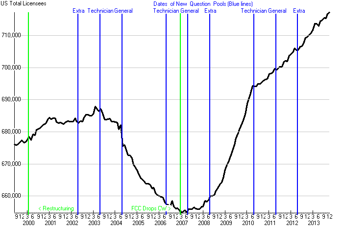 The Amateur Radio population in the US has continued to show steady growth. As of the end of 2013, the FCC database showed 717,201 licenses in its Universal Licensing System (ULS). That’s the greatest number of US hams ever and up from 709,575 in December 2012. The volume of Amateur Radio applications slowed somewhat to 141,943 from its zenith of 176,826 in 2007, the year the FCC dropped the Morse code requirement.