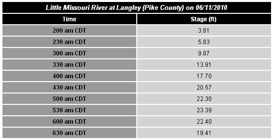 The National Weather Service issued a flood warning about 2 AM -- just after the heaviest rains had started. As the heaviest rains began hitting, a gauge at Langley showed the Little Missouri River was less than 4 feet deep. The river climbed to 20 feet within four hours. State officials said that the terrain and lack of cell phone service in the valleys made communication difficult. Arkansas Governor Mike Beebe said damage at the campground was comparable to that caused by a strong tornado; the force of the water carried one body 8 miles downstream.