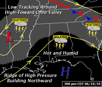![While high pressure began building over the southeast United States on June 10, a storm system aloft moved slowly around the high from Northeast Texas into Southwest Arkansas. In the picture, s storm system (L) tracked into Arkansas from the southwest with scattered to numerous showers and thunderstorms on June 10. The system moved around a building ridge of high pressure (H) in the southeast United States. [Map courtesy of the National Weather Service, Little Rock]](/img/130x97/exact/News/NWSmap1.gif)