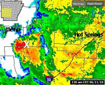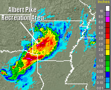 ![Doppler weather radar showed storms continually developing to the southeast of Mena (Polk County) and moving over the Albert Pike Recreation Area (Montgomery County -- marked by an X -- during the early morning hours of June 11. There are several small creeks and streams in and around the campground, including the Little Missouri River. These tributaries rose rapidly during the event (due to at least six inches of rain in just a few hours). A woman living in the area most of her life said an event of this magnitude had not occurred since May 1968; however, at that time, it was not the popular camping spot it is today. [Map courtesy of the National Weather Service, Little Rock]](/img/130x97/exact/News/NWSmap5.gif)