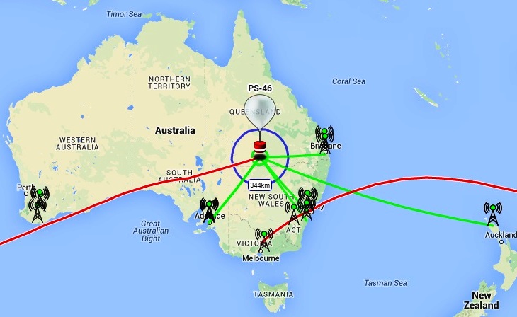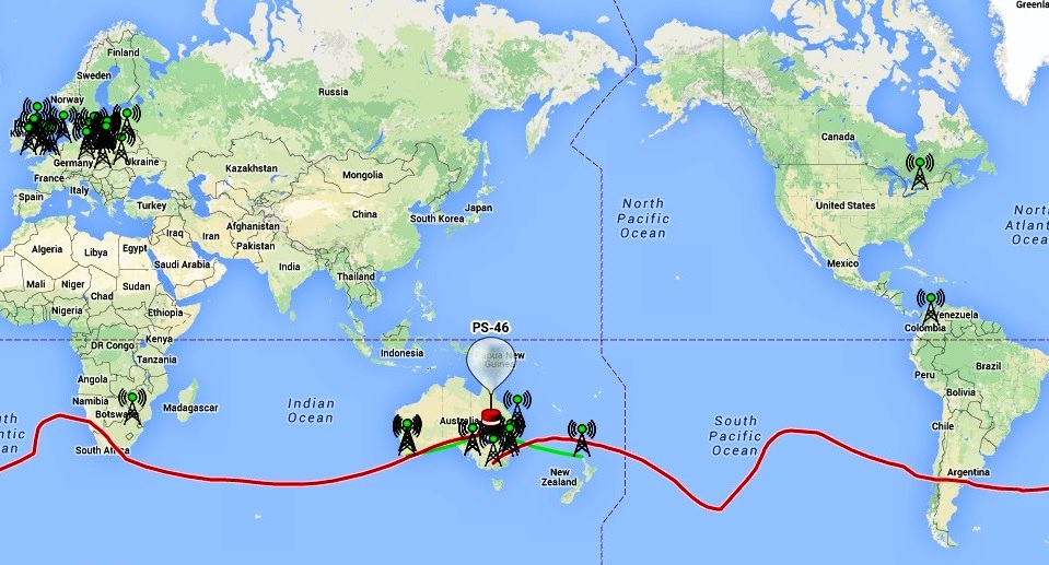 The helium balloons in this series carried a solar-powered 25 mW transmitter which sent WSPR, JT9, and sometimes Olivia signals on 30 and 20 meters, enabling their tracking and the gathering of reports on altitude, speed, direction, and battery condition. The PS-46 balloon completed its journey around the globe in slightly more than 12 days. – Thanks to Jim Linton, VK3PC
