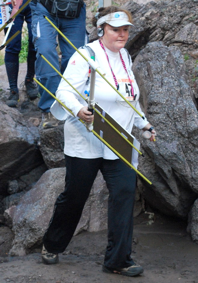 ![Marji Garrett, KJ4ZKC, sets out on the 2 meter course with her home-built measuring-tape Yagi antenna and map board mounted to it. She is on her way to a Region 2 gold medal on 80 meters in the category for women ages 50-59. This is her second national championship. [Joe Moell, K0OV, Photo]](/img/130x97/exact/News/ARDFkj4zkc1.jpg)