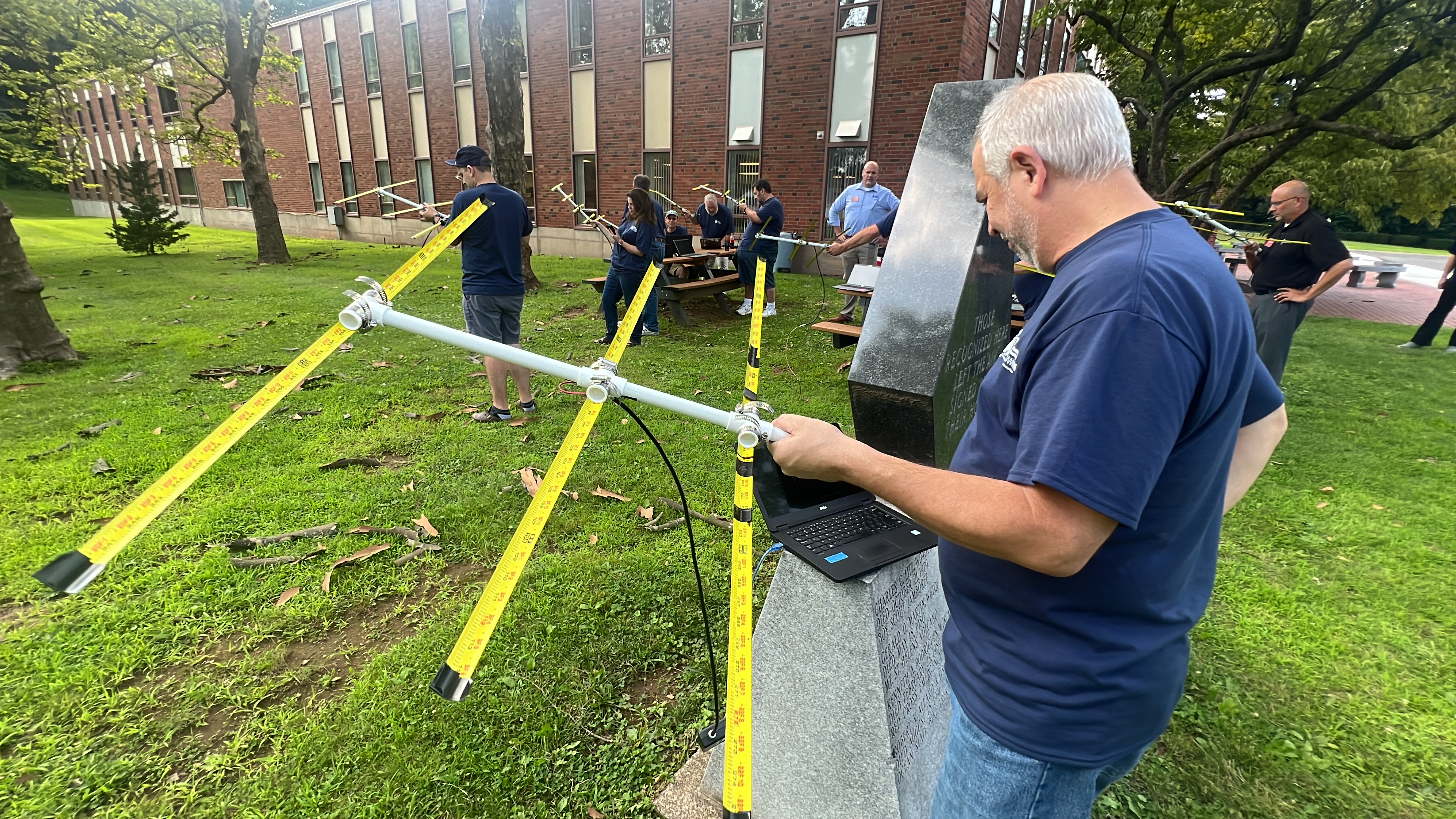 The teachers thought it was cool. "Amateur radio is so important to the future of engineering and STEM in our country," said Kristen Kucko, KQ4ECP, one of the institute participants. The group gathered outside ARRL Headquarters with antennas they had made earlier in the day. As the pass happened, the educators tracked the ISS by hand. A warble of SSTV transmission filled the air, and the group was excited. After the pass, they used laptops to decode the audio stream into an image, while they sat on picnic tables and enjoyed pizza and wings.