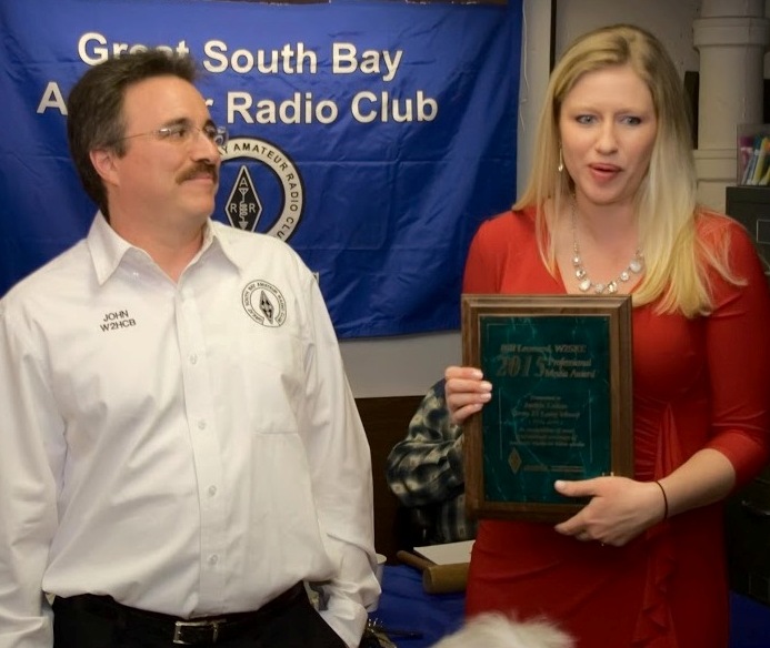 ![News 12 Long Island reporter Jackie Lukas received the 2015 Leonard Award from Great South Bay ARC President John Melfi, W2HCB (left), at the March 2016 meeting of the Great South Bay Amateur Radio Club. [Kevin Morgan, AB2ZI, photo]](/img/130x97/exact/News/Jackie Lukas-Bill Leonard Awd.jpg)