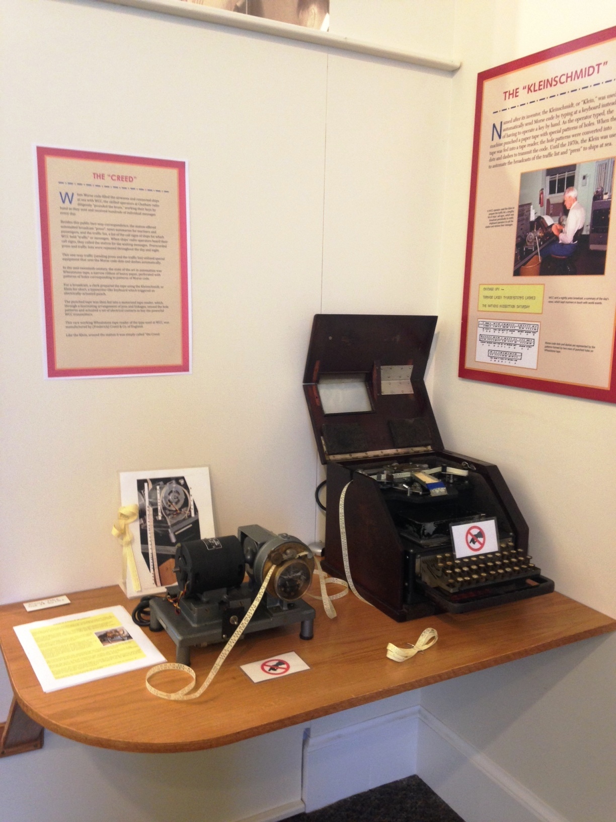 “Our members and supporters raised the funds, and we were able to purchase the Creed machine, a custom table, and an entire exhibit to showcase this item and how it worked with our Kleinschmidt machine,” Bassett recounted. The Kleinschmidt machine — or “Klein” — refers to the equipment used to create the punched “Wheatstone” tape, the narrow ribbon of heavy, perforated paper read by the Creed keyer.