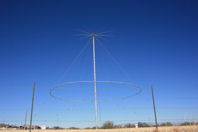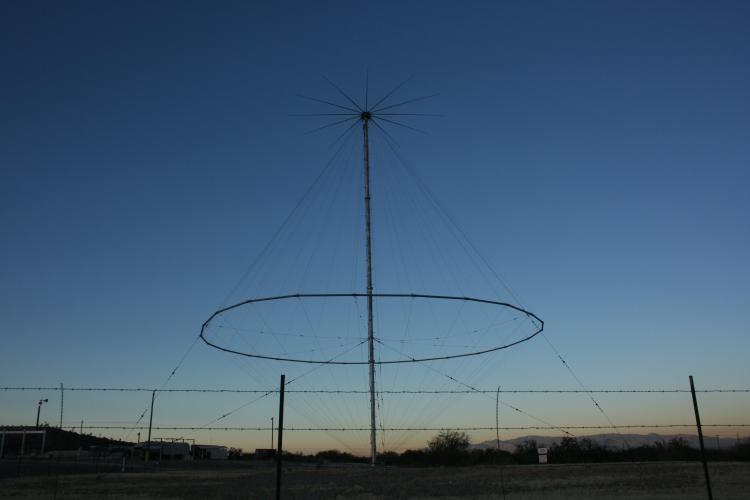 In the early 1960s, as part of the installation of the Base 571-7, the Collins Radio Company erected an absolutely beautiful discone antenna at the missile site. Discones are broadband antennas -- they are capable of radiating signals over a wide range of frequencies. The lowest usable frequency on a discone is established by the physical dimensions of the antenna. This particular antenna is something on the order of 80 feet tall, with an enormous crown, which means it will radiate effectively over a large portion of the HF spectrum.
