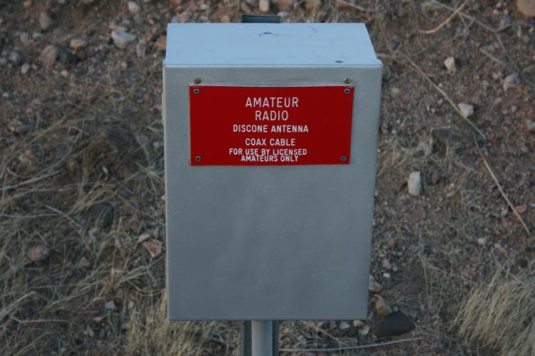 The museum's discone is erected behind a security fence, so you can't actually walk up to it and touch it. Electrical access is provided by a UHF connector housed inside a metal junction box just to the south of the antenna. As it turns out, someone was courteous enough to include a length of coax to link the box to my radio gear. I was prepared, however. I brought and used my own cable.