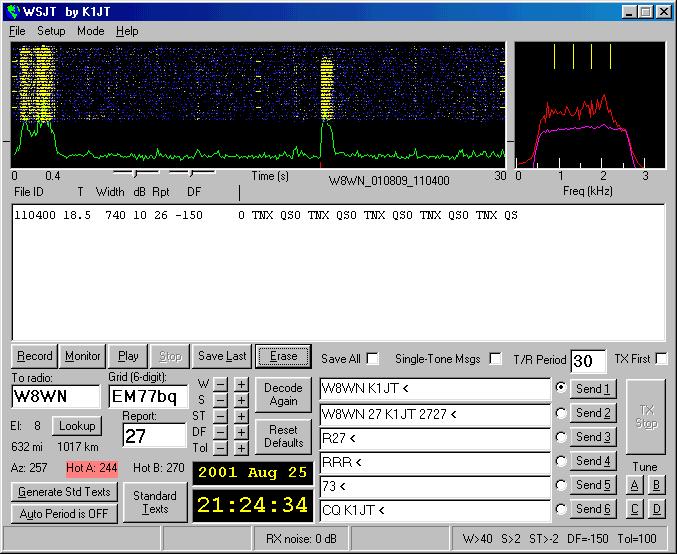 Some meteor scatter operators prefer to use SSB, making rapid exchanges of signal reports and grid squares. In recent years digital meteor scatter has been increasing in popularity. With the free sound-card-based WSJT software suite by Joe Taylor, K1JT, it is possible to make digital meteor scatter contacts almost any time of the day or night, not just during annual showers. Most WSJT scatter operators use a mode known as FSK441 and center their activities on calling frequencies at 50.260 and 144.140 MHz. They also announce their availability by using Web sites just as N0UK's Ping Jockey Central.