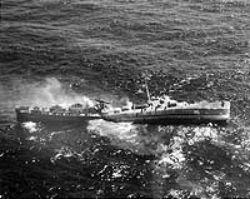 We took two torpedoes — one forward and one aft. The ship heeled over and went down. I don’t know how many guys got off, but it couldn’t have been many. Franz and I had been up on the boat deck checking out a blinker light that wasn’t working. We just got tossed into the sea. We could see two life rafts, but it was dark so nothing else was visible. We climbed aboard. We could hear nobody else around us. We guessed the whole crew went down. The sea was fairly calm but we had little idea where we were and didn’t know anything at all about navigation. There was a stash of provisions aboard. A tank of water was gratefully received. It looked like enough to keep us alive for a while.