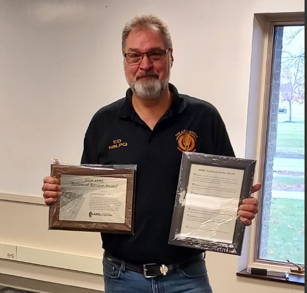 Ed Menasian, N8LPQ, Toledo, Ohio, is the recipient of the 2024 ARRL Technical Service Award. He was presented the award plaque and motion certificate by ARRL Great Lakes Division Director Scott Yonally, N8SY, at a ceremony held November 23 at the Toledo Emergency Management Agency.
