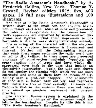 In his 1923 review, S. Kruse, 1OA, has some harsh words for this book (see a copy of the original review in the Photo Gallery below). It “is written down to the small boy, the absolute beginner...” It has “well-conceived diagrams and figures,” but “weak draughtsmanship.” “In these pages are preserved the well-nigh forgotten ...spark sending sets that have wholly disappeared.” Kruse thought Collins was woefully behind the times.