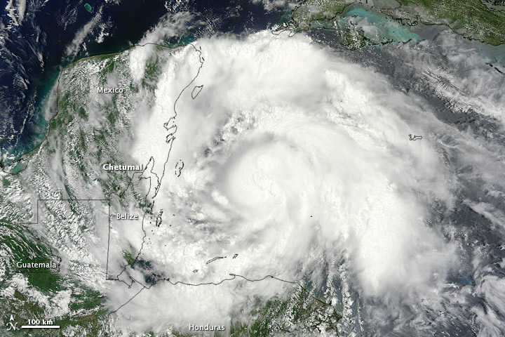 ![Ernesto strengthened to a hurricane by August 7, 2012, according to US Air Force hurricane hunters. At 2 PM EDT August 7, the National Hurricane Center (NHC) reported that Ernesto was located about 185 miles east of Chetumal, Mexico. The storm had maximum sustained winds of 80 miles per hour and was headed toward the west-northwest at about 14 miles per hour. The Moderate Resolution Imaging Spectroradiometer (MODIS) on NASA’s Terra satellite captured this natural-color image of Tropical Storm Ernesto on August 7. Ernesto’s spiral arms spanned hundreds of kilometers, and extended over parts of Mexico, Belize, and Honduras. [Photo courtesy of NASA/Jeff Schmaltz, LANCE MODIS Rapid Response Team, Goddard Space Flight Center]](/img/130x97/exact/News/Ernesto.jpg)