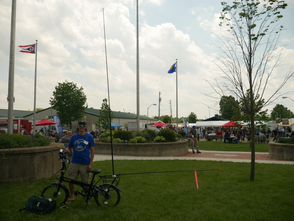 Saturday at Dayton Hamvention was very sunny with a comfortable breeze, and visitors settled into what shade they could find at covered picnic tables or stretched out in grassy areas under a tree throughout the day. Many attendees took advantage of the beautiful weather to continue their hobby as they wove through vendors and food trucks. Chad Greene, KC3CQZ, carried solar panels connected on his backpack to keep his portable equipment powered and operating. Meanwhile, Chris Bravo, W4ALF, rigged antenna masts onto his bicycle to make CW and voice contacts, reaching Arizona, Florida, and what he described as "the shortest QSO ever at Hamvention" -- another Hamvention attendee standing directly in front of him with a handheld transceiver.