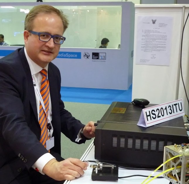 ![ITU Secretary General Hamadoun Toure, HB9EHT, takes up the operating position of HS2013ITU, as IARU Region 3 Chairman Gopal Madhavan, VU2GMN (left), and Sakol Nakin, HS1JNB, look on. [Tony Waltham, HS0ZDX, photo]](/img/130x97/exact/News/ITU Telecom 2013 - Toure.png)