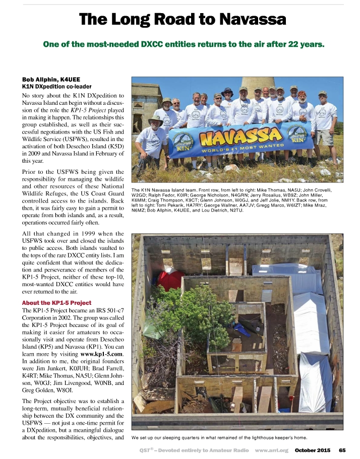 The winner of the October 2015 QST Cover Plaque award is “The Long Road to Navassa” by Bob Allphin, K4UEE.