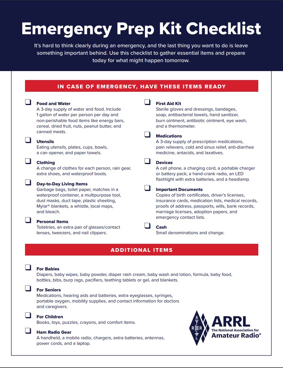 On the ARRL website, there’s an Emergency Prep Kit Checklist. It lists the common items such as food and water for several days, a first aid kit, medications, chargers for your devices and other useful items.