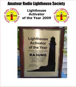 The Amateur Radio Lighthouse Society presents an annual award to the ham who has done the most during the previous year to promote the activation of any of the world’s nautical light beacons. The award consists of an etched brass plaque mounted on a wood base. The photo shows the 2009 plaque as presented to the winner, Jim Elliott, KA3UNQ.