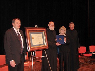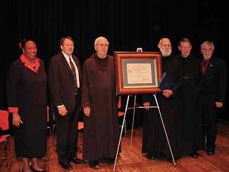![The award was presented to Brother Anselm Allen (second from left) by Deputy Director of the National Weather Service Southern Region Headquarters Steven Cooper (left). Also participating in the ceremony were Kathryn Gough (second from right) from US Congressman John Boozman's office, and Abbot Jerome Kodell (right) of the Benedictine Abbey in Subiaco (Logan County). [Photo courtesy of NWS Little Rock]](/img/130x97/exact/News/nms_839.jpg)