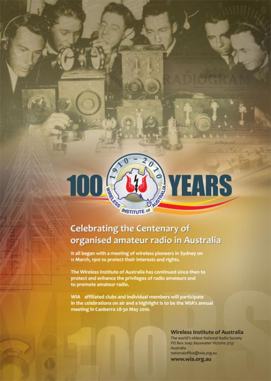 A program of events is being planned to coincide with the WIA's annual meeting, scheduled for May 2010 in Canberra, the nation's capital. Radio clubs throughout Australia are planning events to promote the centenary of organized Amateur Radio in Australia.