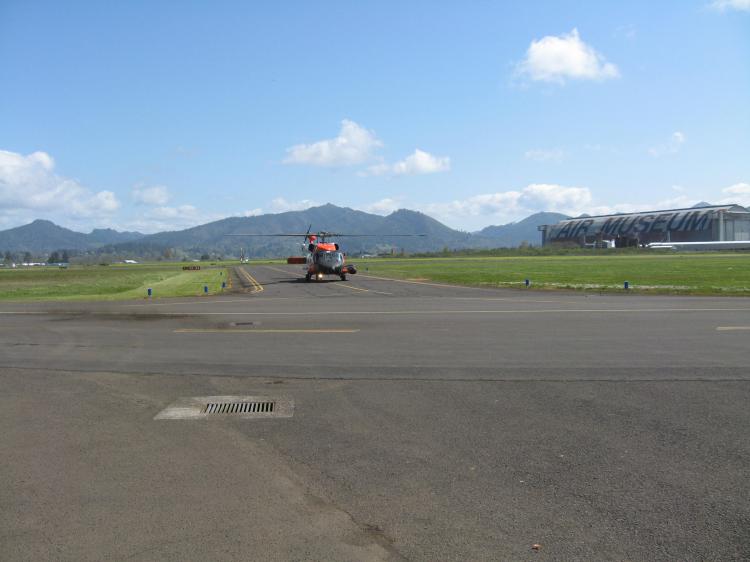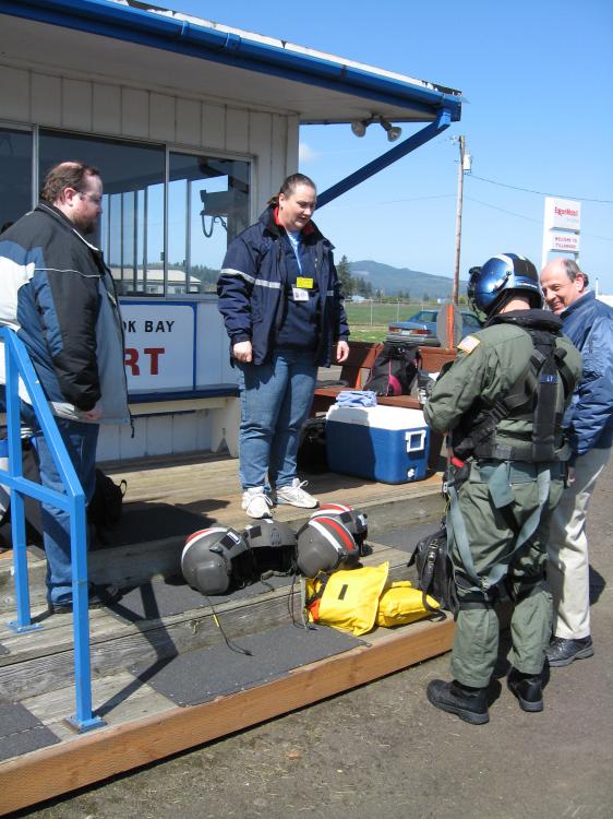 McCraw said that officials participating in Cascade Peril expected that if this were an actual event, roads would be affected, so as part of the simulation, the US Coast Guard dispatched a helicopter to the Tillamook Airport. There it picked up three Tillamook area Amateur Radio operators and flew them to Camp Rilea National Guard Base in Warrenton, about 65 miles north of Tillamook.