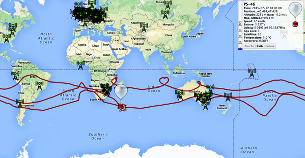 The last station to hear the balloon was Vince Harrison, ZS6BTY, in Pretoria, South Africa. The balloon had been at an altitude of about 9000 meters (29,530 feet), but quickly descended into the ocean.