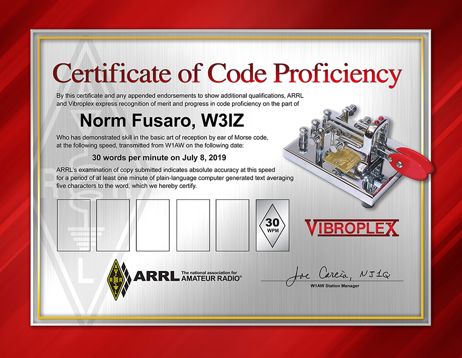 Starting with the August issue, QST will list the recipients of W1AW Code Proficiency certificates. Key manufacturer Vibroplex now is sponsoring the certificates, which debut a new design. The Code Proficiency program has been an ARRL staple for decades. Participants who copy a W1AW qualifying run and submit 1 minute of legible solid copy and the $10 certificate fee can qualify.