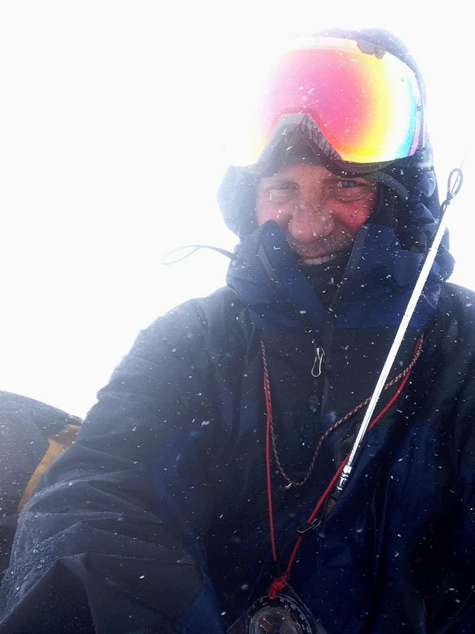 “[T]hings went smoothly until about 12,700 feet,” Byland said, at which point, with visibility deteriorating, he decided to turn back. “It wasn’t long before I was in a total whiteout,” he recounted. “The ground is white, the air around me is white, and I had no perception of direction and elevation. My iPhone GPS was of no use as I couldn’t read the display. I pulled out my compass for navigation.” Byland said he knew the basic heading he should follow along the ridge, and he proceeded.