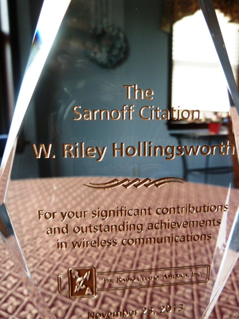 Hollingsworth’s engraved award, dated November 23, says, “For your significant contributions and outstanding achievements in wireless communications.” Other Sarnoff Citation laureates include US Senator Barry Goldwater, K7UGA (SK), ARRL Roanoke Division Director Dennis Bodson, W4PWF, and two-way radio pioneer Fred M. Link, ex-W2ALU (SK).
