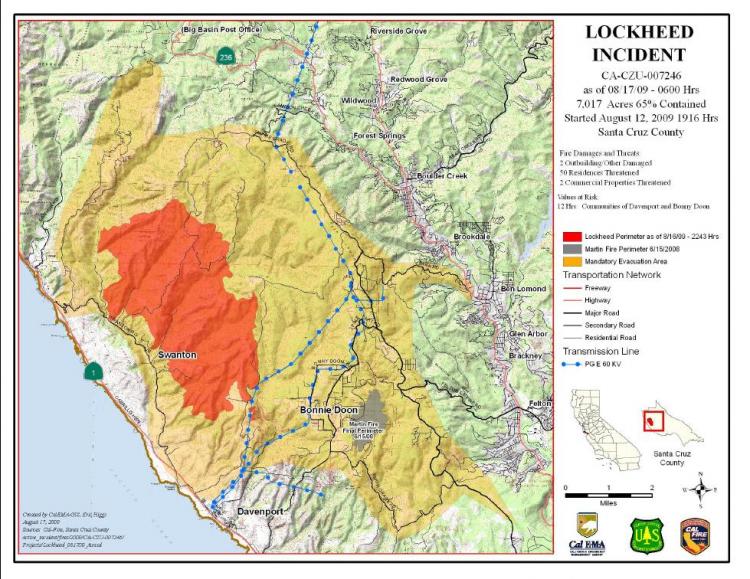 ![The yellow area indicates the mandatory evacuuation area and the red shows the perimeter of the Lockheed Fire. The grey area shows the location of the 2008 Martin Fire. [Map courtesy of CAL Fire]](/img/130x97/exact/News/nms_1115.jpg)