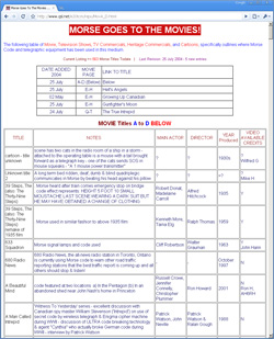 Robbie Burnet's "Morse Goes to the Movies" Web site fell off the face of the Internet a few years ago, but Jeerasak Pitiwatsakul, E20TCM, came to the rescue and archived Mr Burnet's handiwork on his Morse Code Web page. Not surprisingly, the code shows up in Westerns, war and spy flicks, but also appears in some unlikely places like comedies and romances. So you never know where you will encounter the code next.