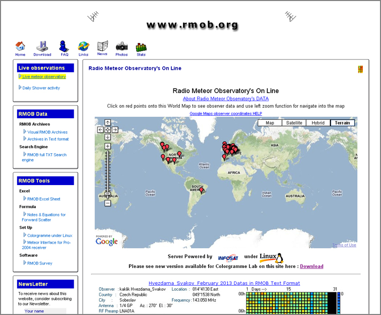 While on the RMOB website, check out a free computer program called Colorgramme Lab v2.5 by Pierre Terrier (click on the “Download” icon and then click on the “Free Windows Software” link to get the program). After downloading and installing the program, go back to the RMOB home page and click on the “Live meteor observatory” link under “Live observations” to display a Google Map that shows active participating meteor observers as indicated by the red pushpins on the map. RMOB data appears below the map, and if you installed and configured Colorgramme Lab correctly, your observatory will also appear.