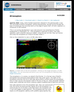 "This is an exciting development," says solar physicist Lika Guhathakurta of NASA headquarters in Washington, DC. "The ionosphere is important to pilots, ham radio operators, earth scientists and even soldiers. Using this new 4D tool, they can monitor and study the ionosphere as if they're actually inside it."
