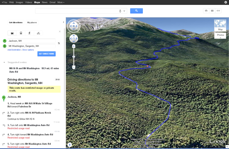 Say you want to go mountain-topping on Mount Washington this weekend, but you've never been and you need directions. Go to Google Maps, click on the “Get Directions” button, type your home address in the field labeled “A,” and “Mount Washington, NH” in the field labeled “B,” then click on the blue “Get Directions” button.