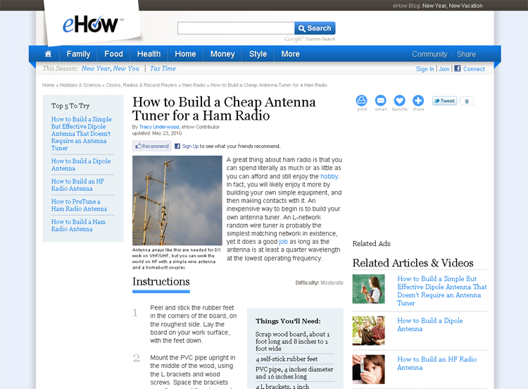 Meanwhile, Tracy Underwood, KU4FL, describes how to build an inexpensive tuner at eHow.com.