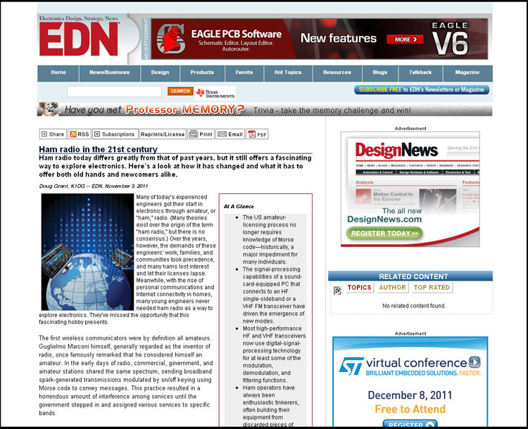 Titled “Ham Radio in the 21st Century” by Doug Grant, K1DG, you can read the whole article here on the EDN website.