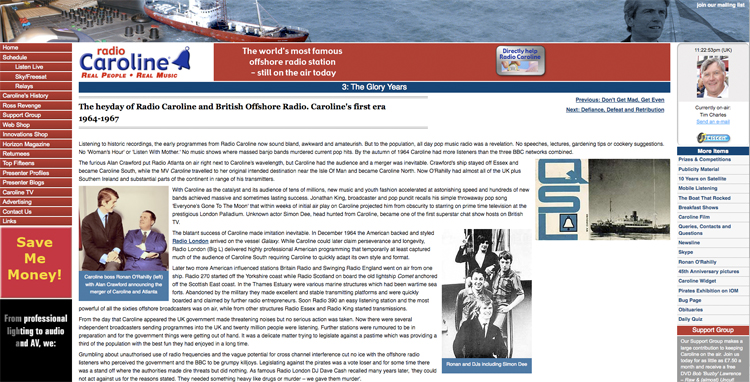 If you find Wikipedia's telling of the Radio Caroline may be a little on the dry side, I urge you to visit the Radio Caroline Web site, which not only recounts the history of station in great detail, but also offers an interesting array of other features. Unbeknownst to me, Radio Caroline is still alive and well and you can listen to it via the Internet (as I am doing as I type these words).