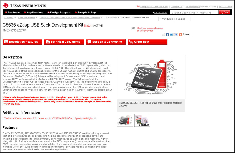In his November/December 2011 QEX “SDR: Simplified” column, Ray Mack, W5IFS, introduces an inexpensive DSP development platform, the Texas Instruments TMS320C5535 eZdsp board. This evaluation board is on sale at the TI eStore for $55. This sale only lasts until October 24. After that, the cost goes back to the normal price of $99. Interested readers may want to take advantage of this special off by going to the C5535 eZdsp USB Stick Development Kit webpage.