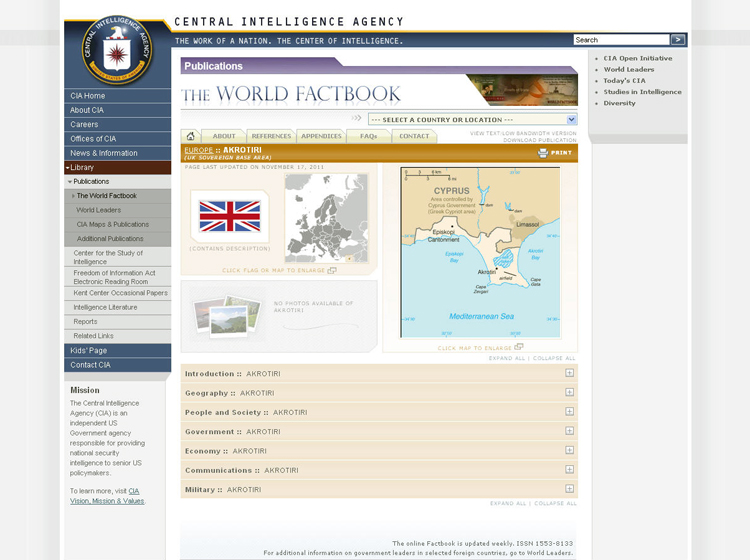 When I pulled down Factbook’s drop-down “Select a Country or Location” menu, I selected the first item that I was clueless about: Akrotiri, which is a British military base on Cyprus (the UK’s version of the US’s Guantánamo Bay).