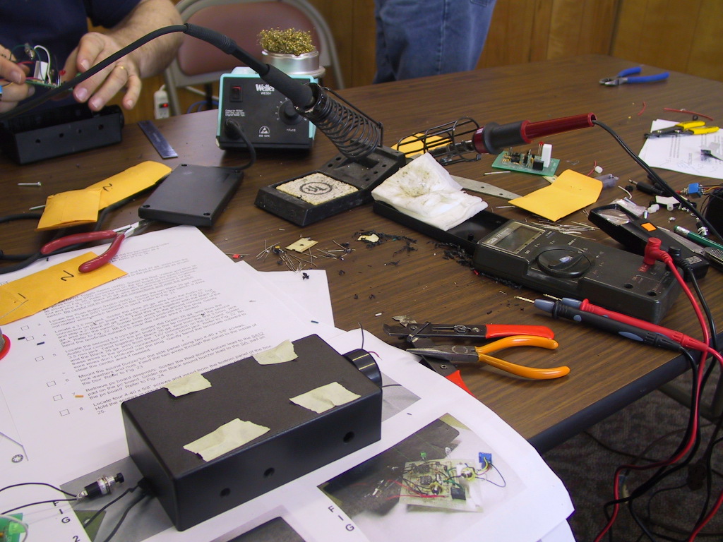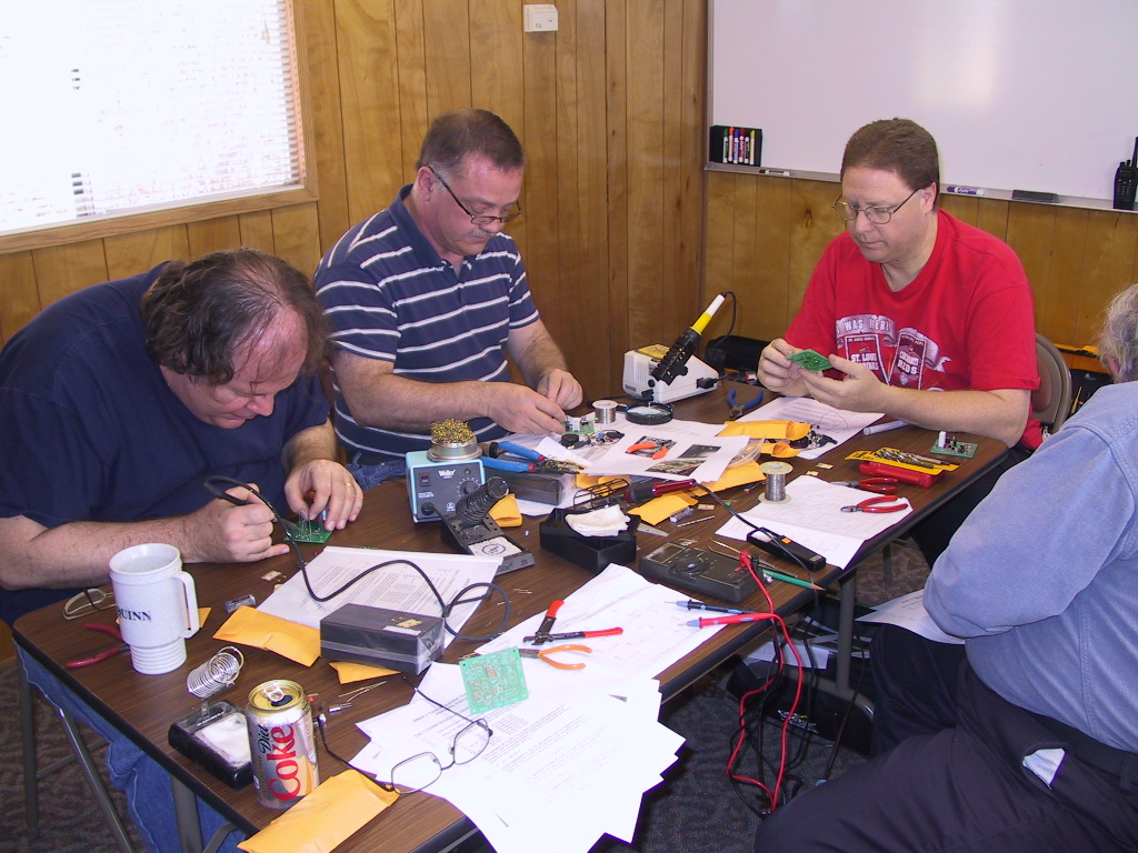 Jeff was amenable to supplying the parts at cost and guiding us through the assembly process. It took a while to get the components and arrange for a place where we could have a dozen soldering irons going at once. But our patience paid off, and this month we finally held our first kit building session at the MARA (Monsanto Amateur Radio Association) club house trailer.