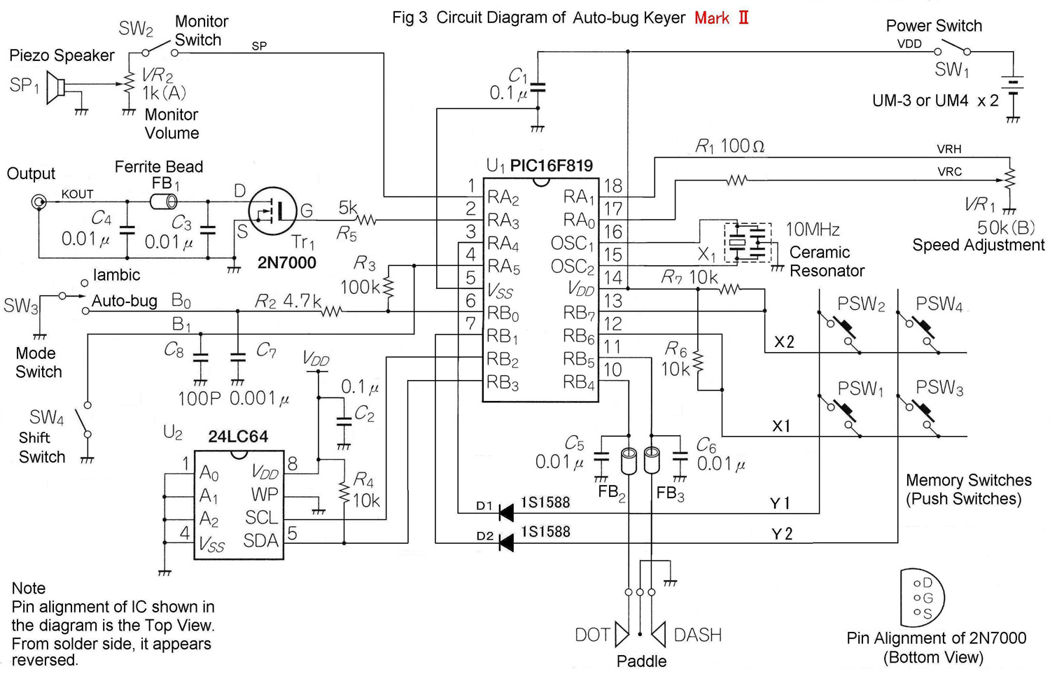 Taka K. Shimazu received his first Amateur Radio license in 1965 and upgraded to the (Japanese) First-class license in 1975. While working for his employer in the US in 1986 he held the call KE6QO. Business travel took him to Singapore from 2000 to 2003 where he operated as 9V1DJ. He enjoys building his own transceivers, transverters, linear amplifiers and peripheral equipment including keyers. Some of his home brew equipment still uses tubes. The auto-bug is the nineteenth keyer he has built since 1968.