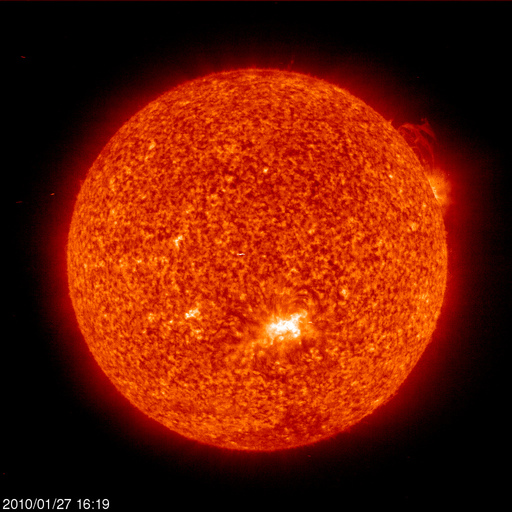 Recent sunspot activity is increasing, and the numbers bear this out. The average daily sunspot number for 2009 was 5 and the average for 2008 was 4.7. There's not much difference in those numbers, but those are for calendar years; the trend toward the end of 2009 was increasing sunspot activity. The average daily sunspot numbers for 1999-2009 were 136.3, 173, 170.3, 176.6, 109.2, 68.6, 48.9, 26.1, 12.8, 4.7 and 5. On Wednesday of this week, the sunspot number was 0, but it rose to 15 on Thursday with the appearance of new sunspot group 1040. Coming this weekend, sunspot groups 1036 and 1038 are due to return, although we don't know yet if they are still powerful enough to be classed as sunspots. Sunspot numbers for December 31-January 6 were 16, 16, 22, 20, 15, 13 and 0, with a mean of 14.6. The 10.7 cm flux was 79.9, 75.2, 78, 76.4, 73, 76.8 and 77.3, with a mean of 76.7. The estimated planetary A indices were 1, 1, 0, 3, 2, 1 and 1, with a mean of 1.3. The estimated mid-latitude A indices were 0, 2, 1, 3, 1, 1 and 0, with a mean of 1.1.