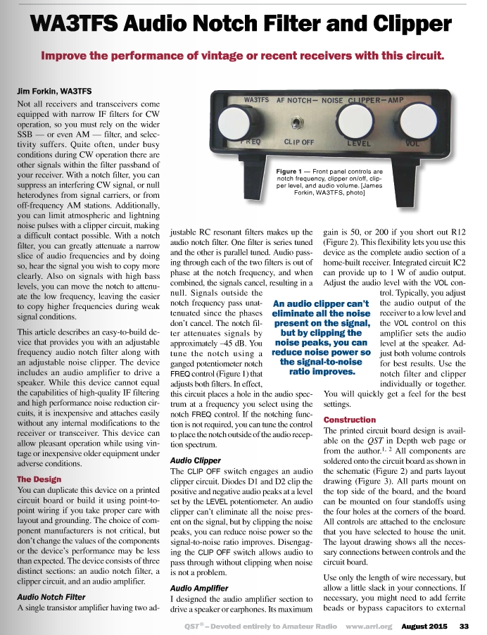 The winner of the August 2015 QST Cover Plaque award is Jim Forkin, WA3TFS, for his article “WA3TFS Audio Notch Filter and Clipper.”
