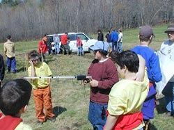 I started to develop a story line that would tie in to scouting to get the interest going. I pulled out my fox hunting gear, hung the compass around my neck, map and HT in hand (see above). It was a quick attraction. As the groups of scouts arrived I handed one of the scouts the custom antenna with a FoxFinder (see QST April 2001) attached, and started the talk with how fox hunting was like Orienteering having map and compass work with the added difficulty that you didn't know were the end point was. Since the FoxFinder is an audio signal strength indicator it was easy for the kids to swing the antenna and hear the signal change without a lot of tutoring. With one or two sweeps of the antenna virtually all of them could give a good direction. Quickly taking turns with the one-minute cycle we projected virtual bearings into the trees.