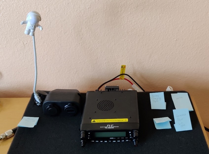 The magnetic mic mount I selected didn’t fit the TYT radio.  Fortunately, a friend 3D-printed me an adapter that works perfectly.  This shack-in-a-box stands in my ham shack/office, ready for use!