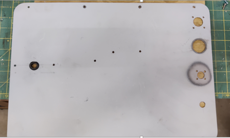 We mounted the radio on the plate and found that the radio’s mounting bracket didn’t allow for up/down positioning. Tony used a compass to get the angle from the front mounting screws to the back, and added a hole a half-inch lower on each rear side of the mounting bracket so the angle of the radio could be adjusted for better viewing.  Picture4.png